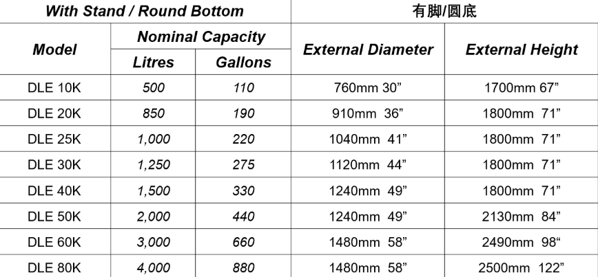 DLE 系列提供从 10,000L 至 80,000L 的多种容量选择,并配有坚固支架以增强使用便利性。产品详细列出直径和高度规格,便于选购合适型号。MAN KIAN HARDWARE & TRADING SDN BHD 致力于为客户供应高质量的大容量储水箱,助您安全高效储水。